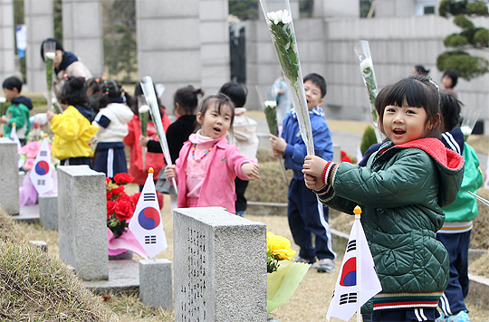 4·19혁명 50주년을 맞은 지난 19일 서울 수유리 국립 4·19 민주묘지를 찾은 서울 석관동의 한 어린이집 원생들이 헌화를 하고 있다. (desk@jjan.kr)