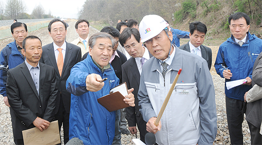 국민권익위 이재오 위원장과 일행들이 21일 전주시 산정동 행치마을과 전라선 철로를 둘러보고 있다.