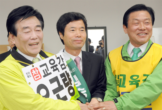 22일 도교육청에서 열린 자율고 지정반대 교육감 예비후보 공동 기자회견에서 오근량·김승환·박규선(왼쪽부터) 후보가 회견 직후 손을 잡고 있다.