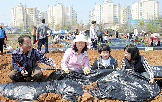 24일 전주 월드컵경기장 인근 텃밭농장에서 휴일을 맞아 가족들이 텃밭을 일구고 있다.