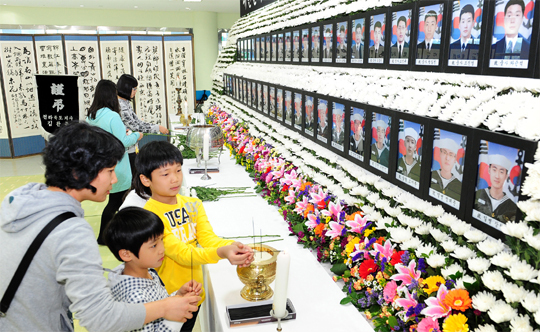 휴일인 25일 천안함 침몰사고의 희생 장병 합동분향소가 설치된 전북도청 대강당 1층에서 시민들이 고인들을 추모하고 있다.