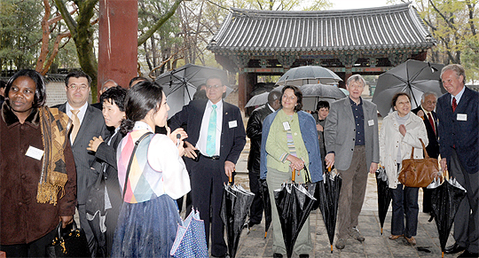 새만금방조제 준공식에 참석하기 위해 전북을 방문한 주한 외교사절단이 26일 전주 경기전을 둘러보고 있다. 프랑스와 러시아, 이집트 등 60여 개국 100여 명의 외국 대사와 가족 등으로 구성된 이들 사절단은 유명환 외교통상부 장관과 함께 전주한옥마을을 찾아 경기전과 전동성당, 한방문화센터 등을 둘러보며 전주의 아름다움을 만끽했다.