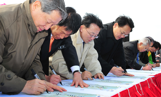 이연택 새만금사업범도민지원위원회 이사장·고석원 전북도의회 의장·김완주 전북도지사·유인촌 문화체육관광부 장관·신삼석 새만금사업범도민지원위원회 부이사장 (왼쪽부터) 등이 깃발축제 행사인 희망나무 메시지 달기에서 각각의 희망사항을 적고 있다.