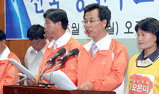 전국농민회총연맹 전북도연맹의 농민후보로 선출된 민주노동당 하연호 도지사 후보가 3일 도의회 브리핑룸에서 기자회견을 갖고 있다.