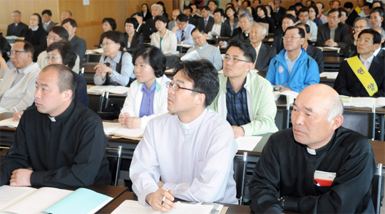 7일 천주교 전주교구청에서 열린 한국 최초의 선교자 윤지충 권상연 학술 심포지엄에서 참석자들이 기조연설을 듣고 있다.