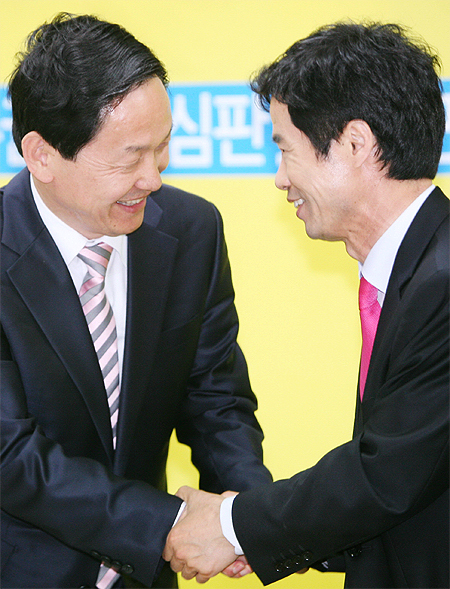 12일 전주를 찾은 김상곤 경기교육감 후보와 김승환 전북교육감 후보가 공동선언문을 발표한 자리에서 악수를 나누고 있다.