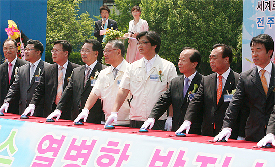 12일 전주 페이퍼 운동장에서 열린 열병합발전소 준공식에 이경옥 행정부지사, 한인수 전주페이퍼 사장이 준공을 축하하고 있다.
