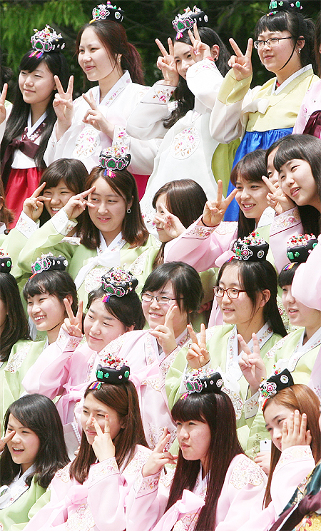 성년의 날인 17일 전주 향교에서 열린 전통관례 재현행사에 참석한 대학생들이 쪽두리를 머리에 쓰고 귀여운 표정을 짓고 있다.