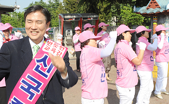 길거리 선거 유세활동이 시작된 20일 전북대학교 앞에서 전라북도 교육감 후보인 김승환 신국중 후보가 선거 운동원들과 율동을 하고 있다.