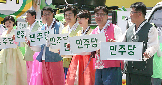 민주당 완산갑 광역 및 기초의원들이 배우자와 함께 20일 전주 풍폐지관(옛 객사)에서 전주의 전통도시 육성 의지를 담아 한복을 맞춰입고 합동유세를 하고 있다.