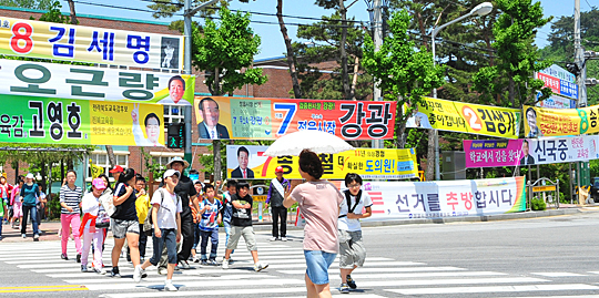 6·2지방선거 운동이 시작된 20일 정읍동초등학교 교문 앞에 선거 현수막이 걸려있다.