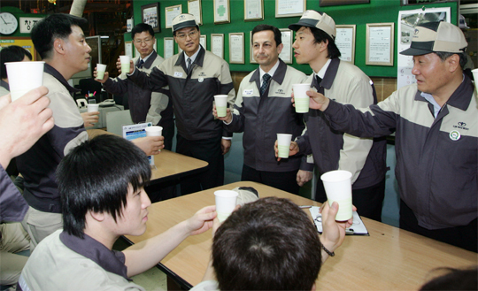 GM대우 마이크 아카몬(Mike Arcamone) 사장이 최근 경영설명회 차원에서 군산공장을 방문해 조립부 현장에서 조합원 및 감독자들과 대화의 시간을 가졌다.