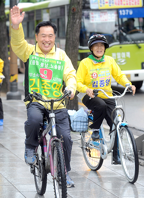 전주시의원에 출마하는 후보자가 자전거를 타고 유세활동을 하고 있다.