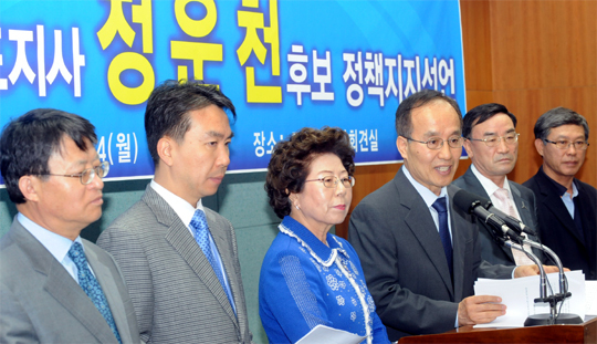 24일 도의회에서 전북 지역 대학교 교수들이 정운천 한나라당 후보의 공약을 공개 지지하는 기자회견을 하고 있다.