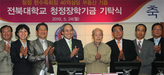 한수옥 청정장학회장이 24일 전북대를 방문 40억원 상당의 부동산을 전북대에 기부하겠다는 기탁식을 갖고 서거석 총장과 함께 기념촬영을 하고 있다.
