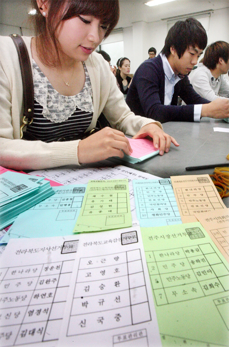 6·2 지방선거를 일주일 앞둔 26일 전주 덕진선거관리위원회 직원들이 인쇄가 완료된 투표용지를 분류하고 있다. 투표는 1.교육감 2.교육의원 3.도의회 의원 4.시·군의회의원 5.도지사 6.시장·군수 7.광역의원 비례대표 8.기초의원 비례대표 순으로 진행된다.