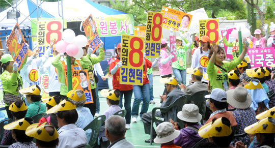26일 전주 양지노인복지관 개관2주년 기념식에 6∂2지방선거에 출마하는 후보자들과 선거 유세원들이 몰려 선거 운동을 하고 있다.