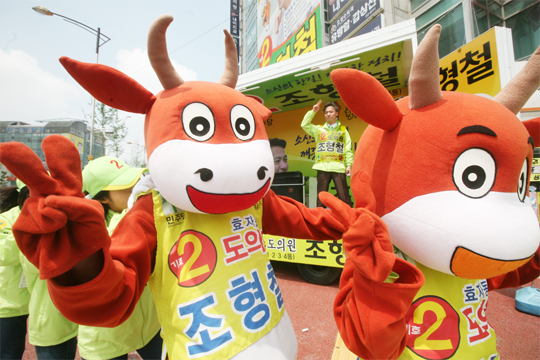26일 전주 상산고 네거리에서 전주 제5 도의원 선거구에 출마한 민주당 조형철 후보의 선거 유세원들이 후보의 황소 인형탈을 쓰고 유권자의 시선을 끌고 있다.