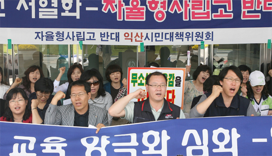 자립형 사립고 반대 전북대책위는 27일 전북도교육청앞에서 고교서열화를 부추기는 자사고 반대 결의대회를 갖고 구호를 외치고 있다.