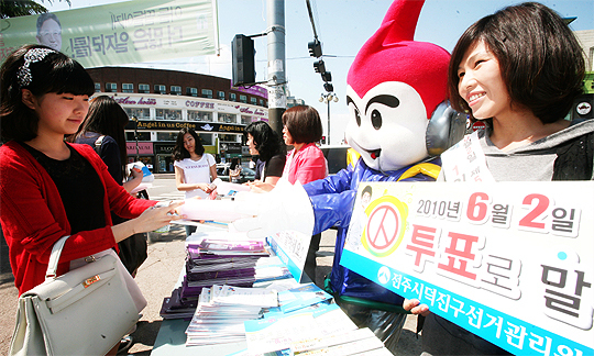 지방선거를 하루 앞둔 1일 덕진구 선관위 직원들이 전북대 구정문 앞에서 학생들에게 투표참여 캠페인을 하고 있다.