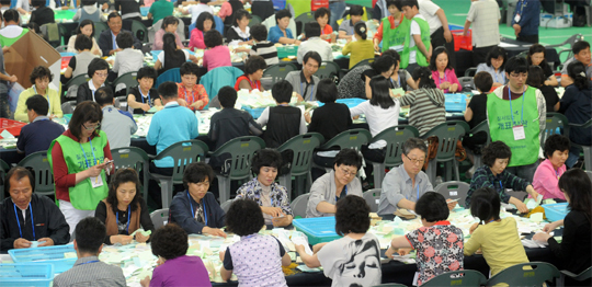 제5회 전국동시지방선거가 실시된 2일 전주 덕진 실내배드민턴 경기장에서 개표 요원들이 개표를 하고 있다.