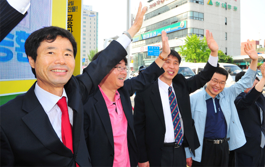 도내 80여개 시민사회단체의 추대를 받아 6·2교육감선거에 출마해 승리한 김승환 당선자가 3일 오전 전주종합경기장 사거리에서 지지자들과 함께 당선인사를 하고 있다.