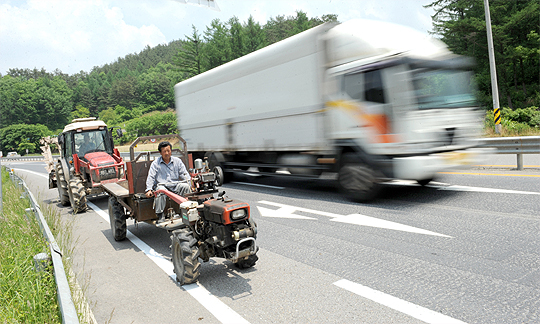 3일 경운기와 트랙터를 운행하는 농민들이 진안군 부귀면 26번 국도 갓길로 지나가고 있다.