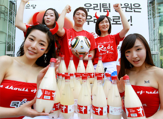 7일 국순당이 서울 광화문에서 개최한 '우리 쌀로 빚은 국순당 생막걸리' 홍보행사에서 모델들이 월드컵 특별 한정제품을 소개하고 있다. 이번 150만병이 제조되는 한정제품은 월드컵 기간동안 전국 할인점과 편의점에서 구매할 수 있다.