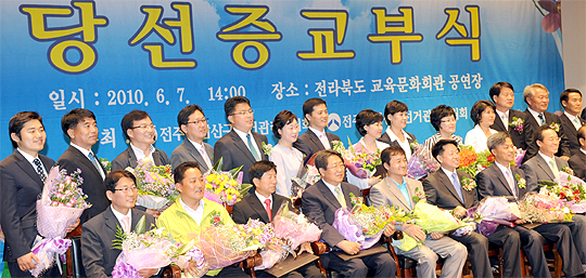 제5회 전국동시지방선거 당선증 교부식이 7일 전주 교육문화회관에서 열려 당선자들이 기념촬영을 하고 있다.
