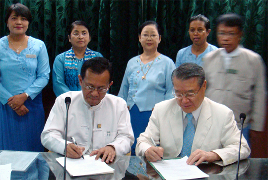 7일 미얀마 양곤경제대학 국제회의실에서 라종일 총장(오른쪽)과 칸 자우 양곤경제대학 총장이 교류를 위한 의향서를 체결하고 있다.