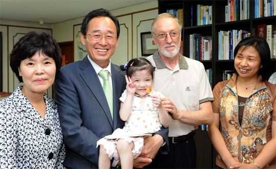 8일 전주시장실에서 송하진 시장과 테리 라이온씨가 박에스터양 돕기 기금을 송효선 전주영아원장에게 전달했다.