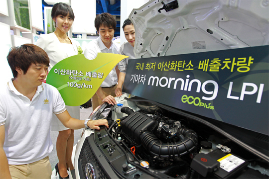 9일 서울 삼성동 코엑스에서 개막된 제32회 국제환경산업기술-그린에너지전에 참가한 대한LPG협회 부스에서 관람객들이 국내최저 온실가스 배출차량인 '모닝에코플러스 LPI'를 관람살펴보고 있다.