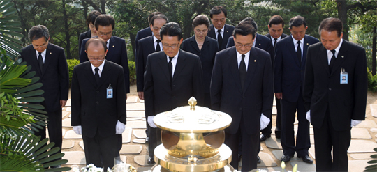 홍재형 국회부의장이 박지원 민주당 원내대표 등 민주당 인사들과 함께 10일 서울 동작동 국립현충원 김대중 대통령 묘역을 찾아 참배하고 있다.