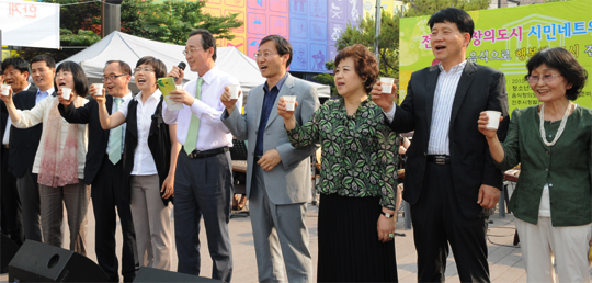10일 전주 오거리문화광장에서 열린 '음식으로 행복한 도시 전주 시민네트워크' 발대식에서 송하진 시장과 참석자들이 막걸리로 건배 제의를 하고 있다.