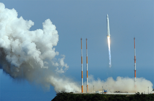 한국 첫 우주발사체 나로호 발사이륙 (나로우주센터 사진공동취재단=연합뉴스) 역사적인 한국 첫 우주발사체 나로호(KSLV-I)가 10일 오후 5시 1분을 기해 이륙 발사되고 있다. 나로호는 그러나 이륙 55초후에 음속을 돌파했지만, 이륙 약 8분 뒤인 오후 5시9분께 통신이 중단되고 이륙 137초 뒤 고도 70km 상공에서 폭발, 추락했다.