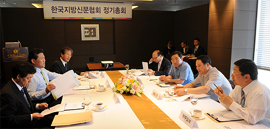 한국 지방신문협회 정기총회가 10일 광주시 치평동 라마다 플라자 호텔 4층 대연회장에서 서창훈 전북일보회장, 김순규 경남신문회장, 송광석 경인일보 사장, 이희종 강원일보 사장, 김종렬 부산일보 사장, 이창영 매일신문 사장, 유제철 광주일보 사장(사진 왼쪽부터)이 참석한 가운데 열렸다.