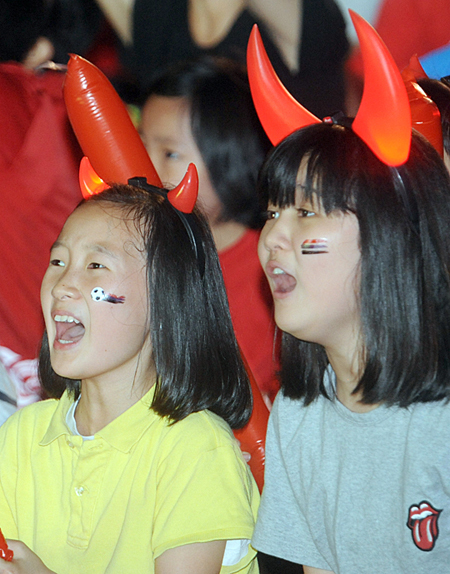 12일 전주종합경기장에서 열린 2010 남아공월드컵 대한민국 대 그리스 경기의 응원전에서 학생들이 대한민국팀을 응원하고 있다.