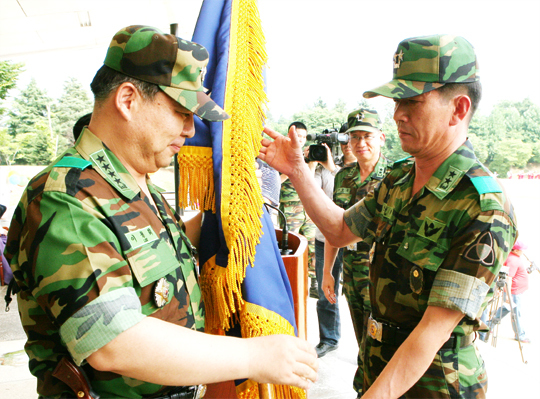 보병 35사단 제33대 사단장 이·취임식이 29일 대연병장에서 열린 가운데 신임 사단장(오른쪽)이 이철휘 작전사령관으로부터 사단기를 받고 있다.