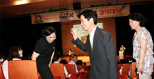 전교조 전북지부와 전북교육혁신네트워크 주최로 지난 9일 전주대에서 열린 전북교육주최 결의대회에 김승환 교육감이 참석해 축사를 한 후 손을 흔들며 인사를 하고 있다.