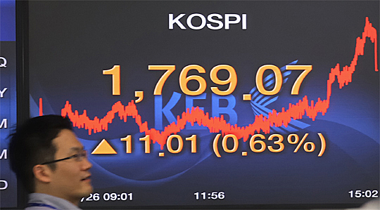 26일 코스피지수가 지난 주말보다 11.01포인트(0.63%) 오른 1,769.07를 기록하며 장을 마감했다. 지난 23일 실시된 유럽은행감독위원회의 '스트레스 테스트'를 7개 은행만이 통과하지 못했다는 소식과 지난 주말 주요국 증시의 강세 등이 코스피지수가 1,760선 위에서 출발하는 배경이 됐다. 한편 원∂달러 환율은 닷새 연속 하락하며 1,190원대 초반까지 내려섰다. 사진은 이날 외환은행 본점 모습.