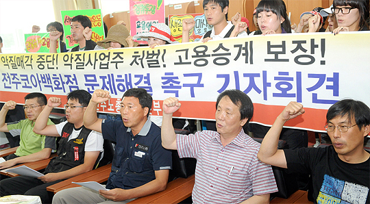 민주노총 전북본부와 코아노조원들이 17일 전북경찰청 기자실에서 전주코아백화점 매각에 따른 고용승계 보장을 촉구하는 기자회견을 하고 있다.