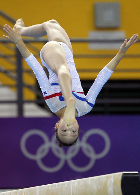 17일 오전 싱가포르 비샨스포츠홀에서 열린 제1회 청소년올림픽 기계체조 여자 개인 예선에서 한국 박경진이 평균대 연기를 펼치고 있다.