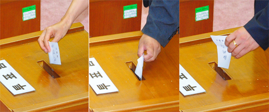 7일 전주시의회에서 열린 제9대시의회 전반기 의장 선출 투표에서 몇몇 시의원이 지지하는 후보의 이름이 감표위원이 볼수 있도록 투표용지를 접지 않고 투표함에 넣는 모습이 카메라에 포착됐다.