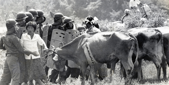 이에 반발한 완주군 농민회 고산지부 축산 농가 500여 명은 소고기 수입 반대를 외치며 항의시위를 벌였다. 전경들은 최류탄을 쏘면서 데모를 진압하려 했으나, 소를 앞세운 농민들은 전경들에게 돌진하며 거세게 반발했다. ('1985 전국보도사진전' 동상 정지영 기자)