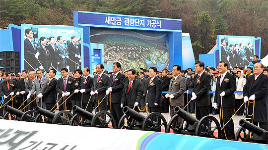 새만금 선도사업인 새만금 관광단지 조성을 위한 기공식이 10일 오전 부안군 변산면 새만금전시관 옆 부지에서 열려 주요 인사들이 물대포를 발사하고 있다. 이 사업은 2019년까지 이 일대 9.9k㎡에 골프장(90홀), 관광테마파크, 호텔, 콘도 등의 관광시설 및 단지를 건립하는 사업이다.