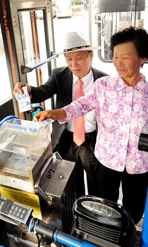 전주-완주간 시내버스 요금 인하 첫 날인 12일 완주 삼례 터미널에서 노인들이 버스 요금인 1000원을 요금함에 넣고 있다.