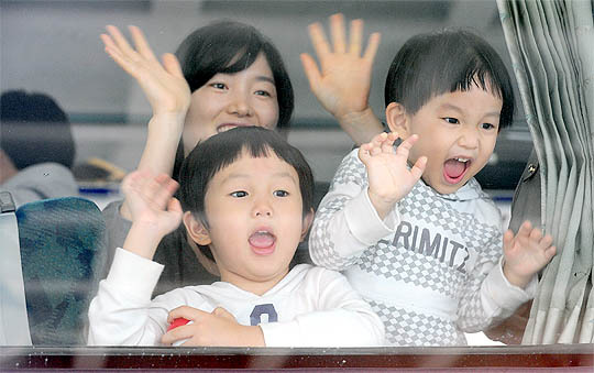 추석 연휴 마지막날인 4일 오후 전주역에서 서울 용산으로 가는 기차안에서 가족들이 손을 흔들고 있다.