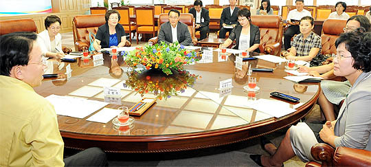 17일 전북도청에서 열린 한국여성경제인연합 전북지회 초청 경제살리기 간담회에서 김완주지사가 여성경제인으로부터 애로사항등을 청취하고 있다.