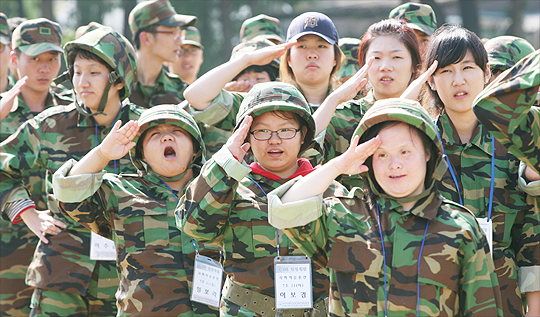 6일 오전 육군 35사단 연병장. '병영체험 훈련'에 참가한 160여명의 지적장애인들이 군복을 갈아입기 위해 분주히 움직였다. 자원봉사자 등 총 400여명이 함께 한 이날, 거동이 불편한 장애인들은 전투복과 방탄헬멧, 탄띠를 착용하는 일조차 만만치 않았지만 어느 때보다 진지하게 훈련에 집중했다.