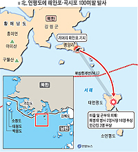 북한군이 23일 오후 2시34분께 부터 1시간 가량 서해 연평도 북방 개머리 해안포 기지에서 연평도로 해안포와 곡사포 100여발을 발사했으며 우리 군도 80여발 이상 대응사격을 했다.